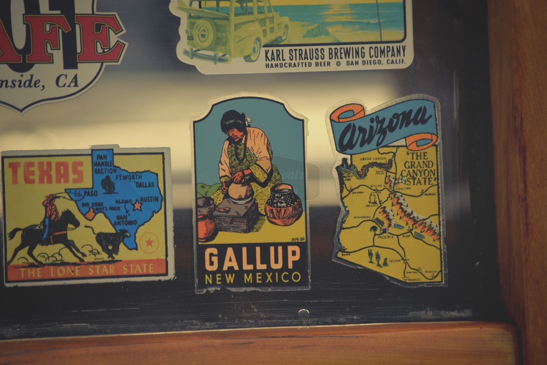 Travel destination stickers on a vintage car.