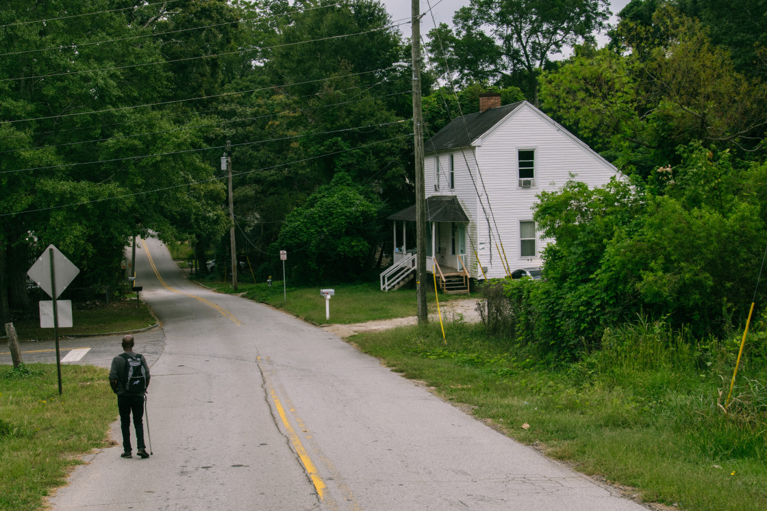 Sense of loneliness and unease, the white house is counterbalanced by the man on the opposite side of the road. Indeed the road divides them. Even the lush vegetation seems to suffocate everything contributes to this mood.