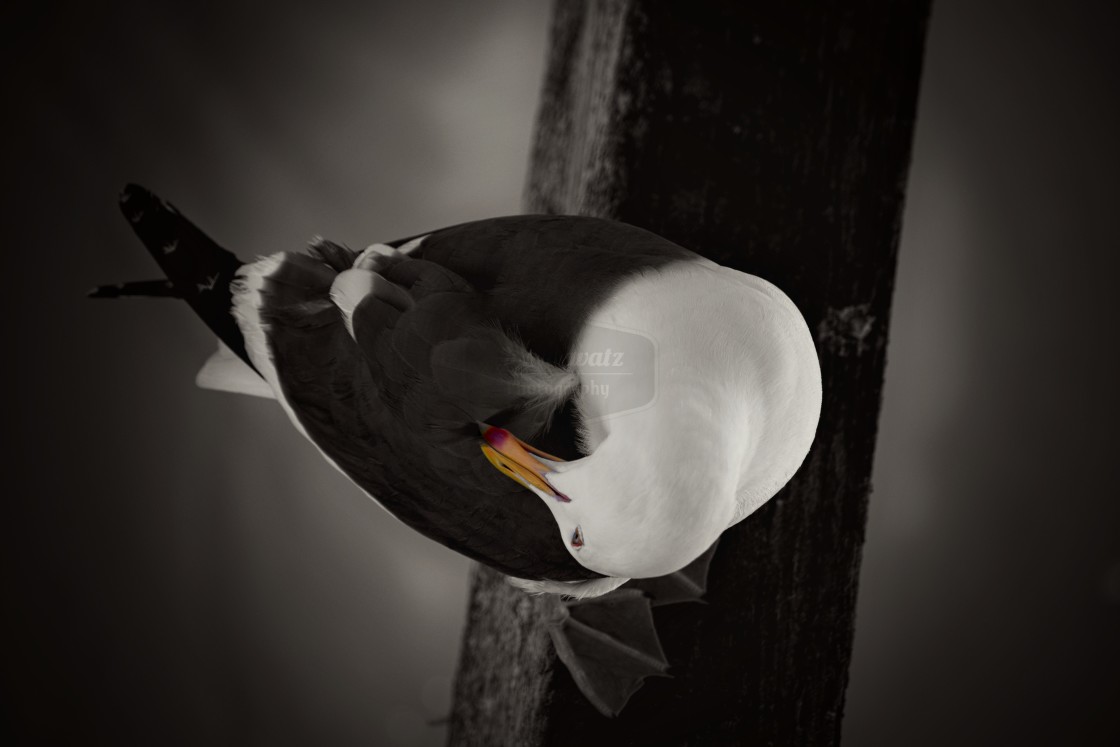 A Seagull portrait in black and white with some selective colors showing