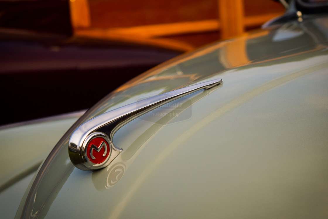 A hood ornament of a classic Morris Minor