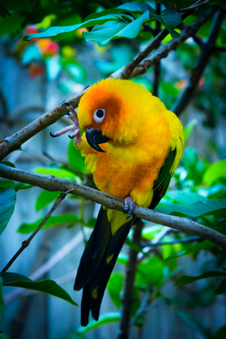 The sun parakeet or sun conure is a medium-sized brightly colored parrot native to northeastern South America. The adult male and female are similar in appearance, with predominantly golden-yellow plumage and orange-flushed underparts and face