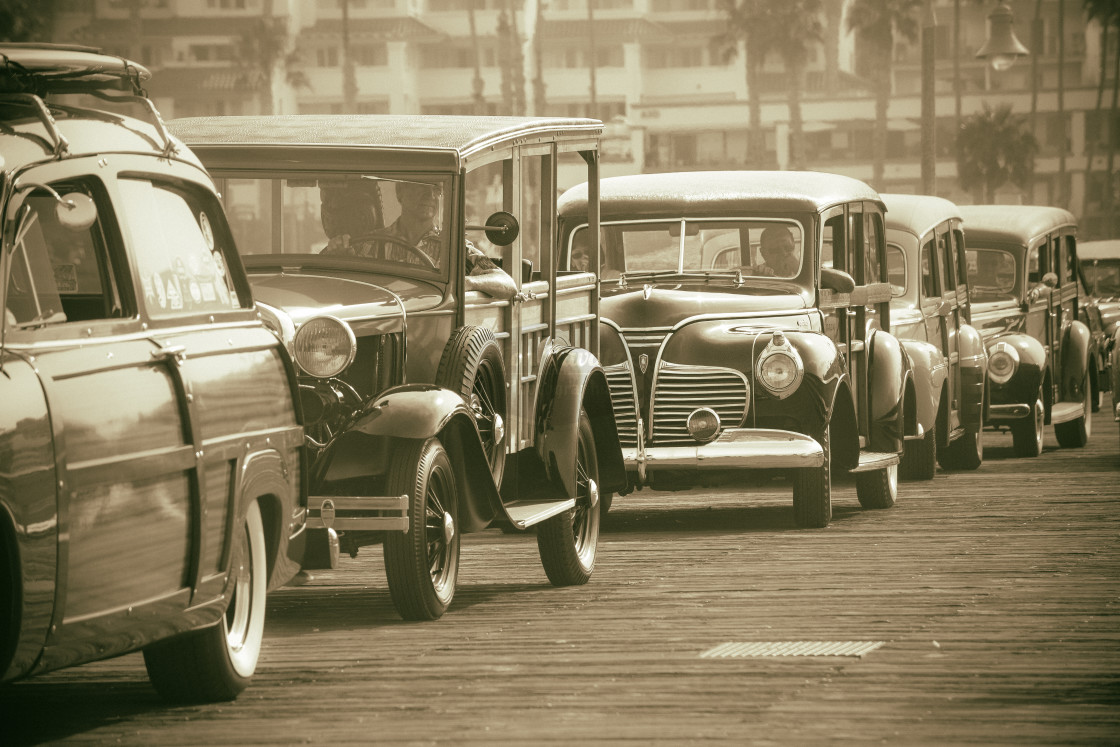 Woodies lined up on a pier in California