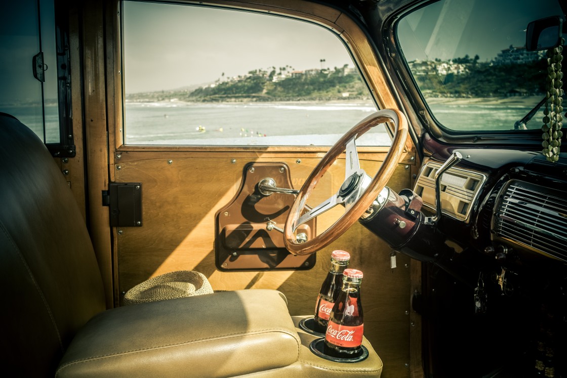 A Woody with coca cola bottles inside on a beach in California. Retro version.