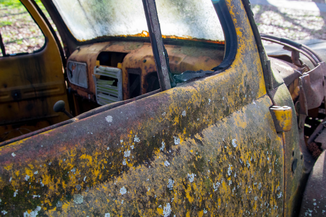 A detail of a discarded Ford Truck.Great moss textures showing the decay.
