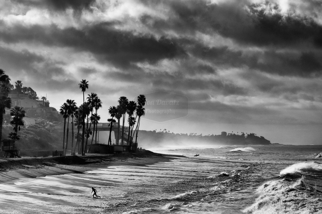 A black and white image of the San Clemente beach in Southern California. A beach goer apparently running away from a big wave rolling in.