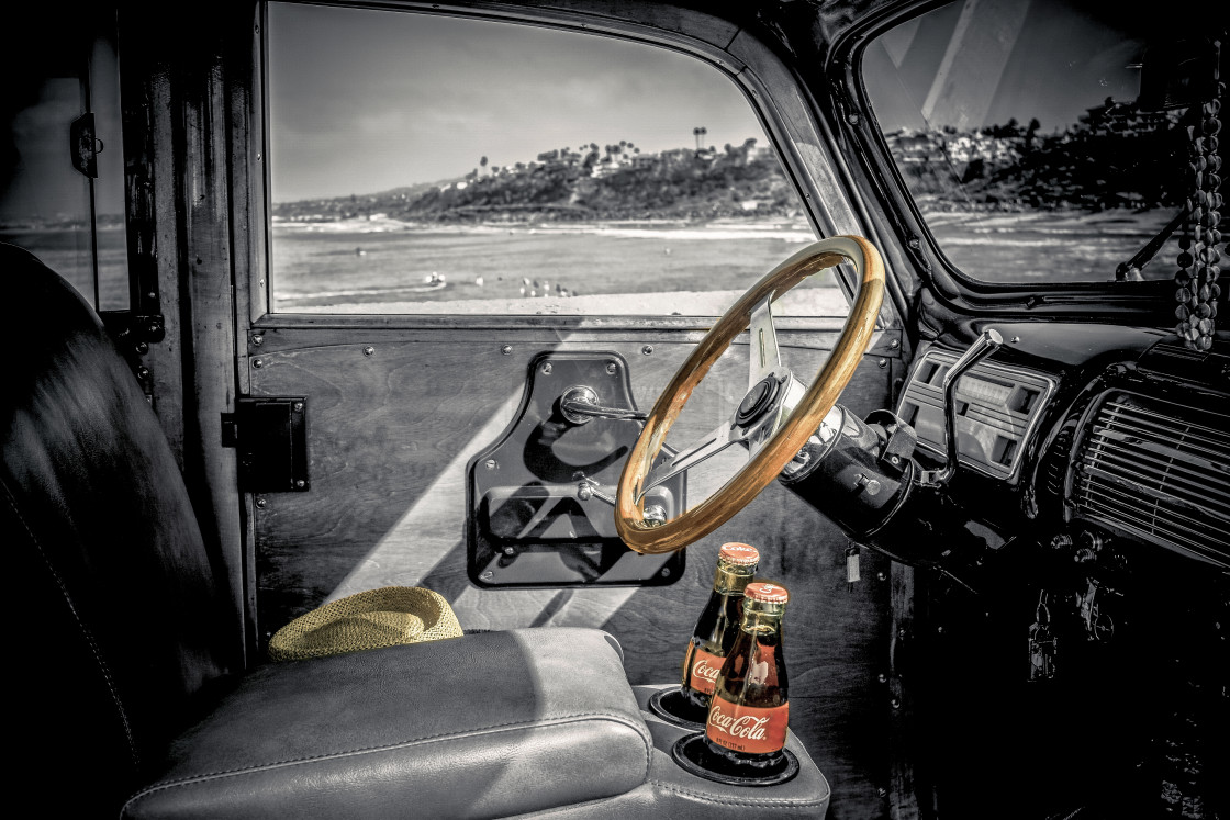 A Woody with coca cola bottles inside on a beach in California. Selective colors