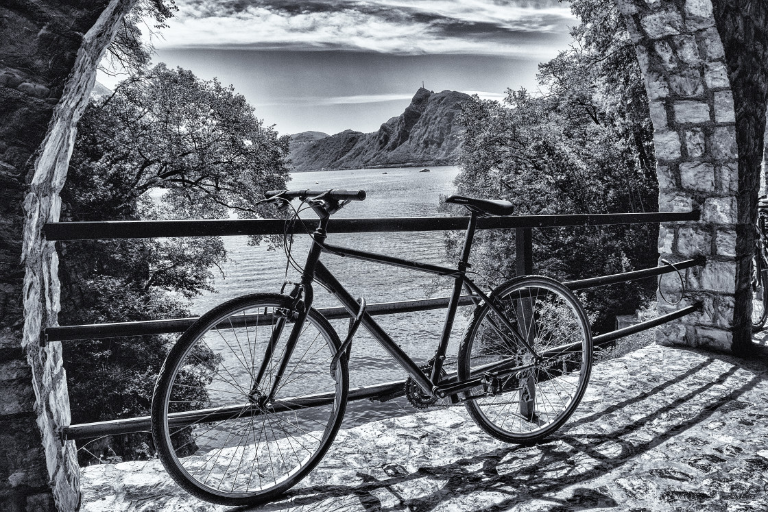 A bike on the Sentiero Di Gandria in Lugano, Switzerland with Monte San Giorgio in the backdrop